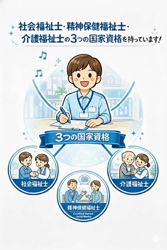 当事務所の矢島は、国家資格 社会福祉士・精神保健福祉士・介護福祉士を有しており、幅広い福祉の知識と経験をもとに、皆さまの生活をサポートいたします。